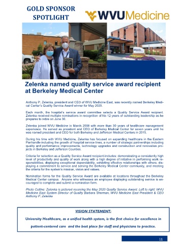 Anthony P. Zelenka, president and CEO of WVU Medicine East, was recently named Berkeley Medi-