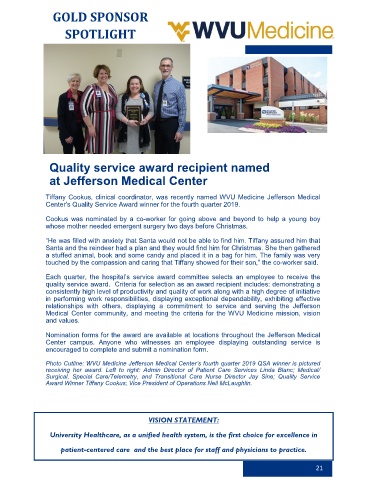 Photo Cutline: WVU Medicine Jefferson Medical Center’s fourth quarter 2019 QSA winner is pictured