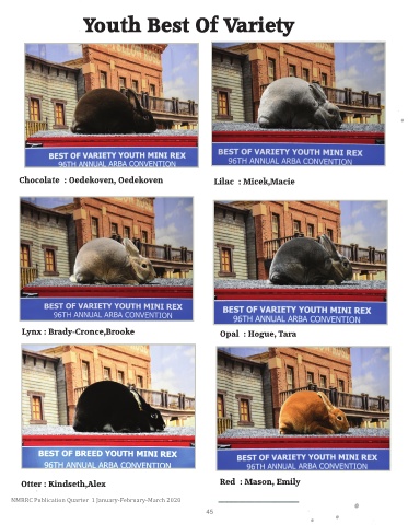 Youth Best Of Variety Chocolate : Oedekoven, Oedekoven Lilac : Micek,Macie Lynx : Brady-Cronce,Brooke Opal : Hogue, Tara Otter : Kindseth,Alex Red : Mason, Emily NMRRC Publication Quarter 1 January-February-March 2020 45