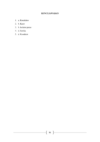 KUNCI JAWABAN 1. a. Konduktor 2. b. Karet 3. b. Isolator panas 4. d. Setrika 5. d. Konduksi 51