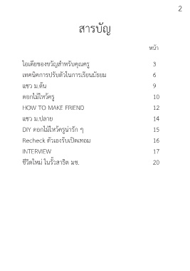 2 สารบัญ หน้า ไอเดียของขวัญสำาหรับคุณครู 3 เทคนิคการปรับตัวในการเรียนมัธยม 6 แซว ม.ต้น 9 ดอกไม้ไหว้ครู 10 HOW TO MAKE FRIEND 12 แซว ม.ปลาย 14 DIY ดอกไม้ไหว้ครูน่ารัก ๆ 15 Recheck ตัวเองรับเปิดเทอม 16 INTERVIEW 17 ชีวิตใหม่ ในรั้วสาธิต มช. 20