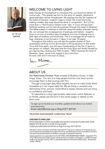 Dear friends, It’s my pleasure to introduce this, our Autumn’s edition of Living Light. This quarter we turn to the story of Joseph, Abraham’s great-grandson whose ‘blockbuster’ life swamps the last 20 chapters of the book of Genesis. Joseph’s ‘rags to riches’ life is barnstorming, making modern day soap storylines tame in comparison. But it is far more than a “Technicolour Dream Coat” tale, in it you will see God faithfully working out his eternal purposes through the seed of Abraham. The Bible makes no attempt to airbrush away the reality of broken family life, nor conceal the consequences of jealousy and hatred. Joseph’s story is not one of modern-day immediacy, but one of staying true in dark days of isolation and loneliness. This is a message we all need to hear, character is not formed in 7-days; it can take 70-years!