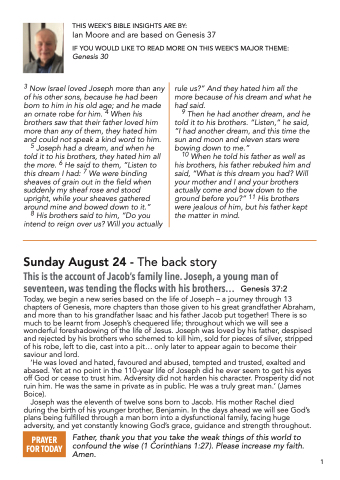 Today, we begin a new series based on the life of Joseph – a journey through 13 chapters of Genesis, more chapters than those given to his great grandfather Abraham, and more than to his grandfather Isaac and his father Jacob put together! There is so much to be learnt from Joseph’s chequered life; throughout which we will see a wonderful foreshadowing of the life of Jesus. Joseph was loved by his father, despised and rejected by his brothers who schemed to kill him, sold for pieces of silver, stripped of his robe, left to die, cast into a pit... only later to appear again to become their saviour and lord.