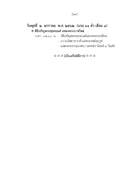 [๒๙] วันพุธที่ ๒ มกราคม พ.ศ. ๒๕๖๒ (แรม ๑๑ ค่ า เดือน ๑) พิธีเจริญพระพุทธมนต์ ฉลองพระบวชใหม่ เวลา ๐๗.๐๐ น. - พิธีเจริญพระพุทธมนต์ฉลองพระบวชใหม่ - ถวายภัตตาหารเช้าแด่พระสงฆ์ทุกรูป - แสดงพระธรรมเทศนา (เทศน์อานิสงส์ ๑ กัณฑ์) [เป็นเสร็จพิธีการ]