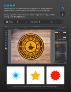 The Star tool can be used to draw star shapes. You can create simple star shapes or more complex objects with numerous rays and long sides.