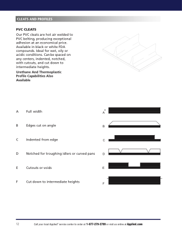 Our PVC cleats are hot air welded to PVC belting, producing exceptional adhesion at an economical price. Available in black or white FDA compounds. Ideal for wet, oily or acidic conditions. Canbe spaced on any centers, indented, notched, with cutouts, and cut down to intermediate heights.