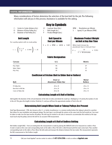 Many considerations of factors determine the selection of the best belt for the job. The following information will aid you in this process. Assistance is available for the asking.