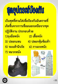 เป็นชุดที่สวมใส่เพื่อป้องกันอันตรายที่ เกิดขึ้นจากการเชื่อมนอกเหนือจากชุด ปฏิบัติงาน ประกอบด้วย 1)ถุงมือหนัง 2) เสื้อหนัง 3) ปลอกแขน 4) ปลอกหุ้มข้อเท้า 5) รองเท้านิรภัย 6) กางเกงหนัง 7) หมวกหนัง 33