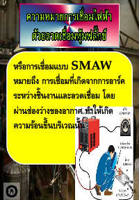 หรือการเชื่อมแบบ SMAW หมายถึง การเชื่อมที่เกิดจากการอาร์ค ระหว่างชิ้นงานและลวดเชื่อม โดย ผ่านช่องว่างของอากาศ ท าให้เกิด ความร้อนขึ้นบริเวณนั้น 36