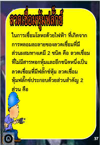 ในการเชื่อมโลหะด้วยไฟฟ้า ที่เกิดจาก การหลอมละลายของลวดเชื่อมที่มี ส่วนผสมทางเคมี 2 ชนิด คือ ลวดเชื่อม ที่ไม่มีสารพอกหุ้มและอีกชนิดหนึ่งเป็น ลวดเชื่อมที่มีฟลั๊กซ์หุ้ม ลวดเชื่อม หุ้มฟลั๊กซ์ประกอบด้วยส่วนส าคัญ 2 ส่วน คือ 37