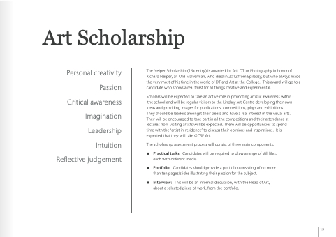 ideas and and providing images for publications competitions plays and and exhibitions They should be leaders amongst their peers and have a a a a a a a a real interest in in the the visual arts They will be encouraged to take part in all the the competitions and their attendance at at lectures from visiting artists will will be be expected There will will be be opportunities to spend time with the the ‘artist in in in residence’ to discuss their opinions and inspirations It is is is expected that they will take GCSE Art The scholarship assessment process will consist of three main components: