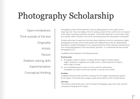 Photography scholars will be expected to to have an an an abiding passion for the subject and an an an enquiring mind They must display a a a a thirst for for working outside of their comfort zone in in in in all aspects of the subject including composition and genre They will be expected to communicate clearly and and maturely reflect critically on their work and and should possess first class problem solving skills Scholars will be keen to experiment and learn about traditional as as well as as contemporary digital photographic processes and will work equally well collaboratively as they do independently Attendance at at weekly Photography CCAs is expected and they will be required to to attend lectures from visiting photographers artists and industry specialists It is is is is understood that they will take photography GCSE Candidates will be assessed in in the following manner: