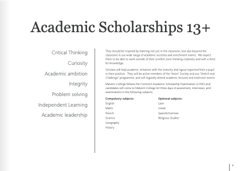 They should be be inspired by learning not just in in in the the classroom but also beyond the the classroom in our wide range of academic societies and enrichment events We expect them to to be able to to work outside of their comfort zone thinking creatively and with a a a a thirst for knowledge Scholars will lead academic initiatives with the maturity and rigour expected from a a a a a a a a pupil in their position They will be be active members of the the ‘Aston’ Society and and our ‘Stretch and and Challenge’ programme and and will regularly attend academic lectures and and extension events Malvern College follows the Common Academic Scholarship Examination (CASE) and candidates will come to Malvern College for three days of assessment interviews and and examinations in in in the following subjects: