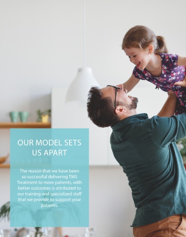 OUR MODEL SETS US APART The reason that we have been so successful delivering TMS Treatment to more patients, with better outcomes is attributed to our training and specialized staff that we provide to support your patients.