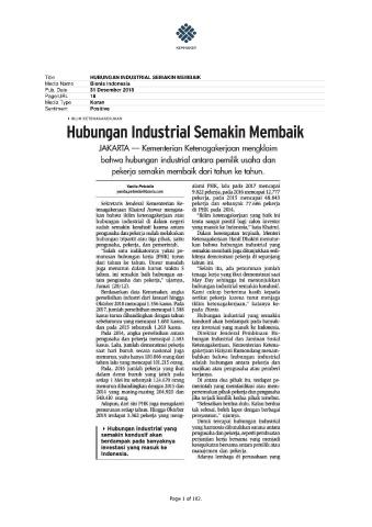 Title HUBUNGAN INDUSTRIAL SEMAKIN MEMBAIK Media Name Bisnis Indonesia Pub. Date 31 Desember 2018 Page/URL 18 Media Type Koran Sentiment Positive Page 1 of 102.
