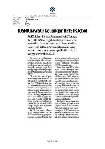 Title DJSN KHAWATIR KEUANGAN BPJSTK JEBOL Media Name Koran Sindo Pub. Date 31 Desember 2018 Page/URL 18 Media Type Koran Sentiment Negative Page 21 of 102.