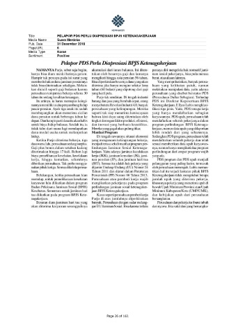 Title PELAPOR PDS PERLU DIAPRESIASI BPJS KETENAGAKERJAAN Media Name Suara Merdeka Pub. Date 31 Desember 2018 Page/URL 6 Media Type Koran Sentiment Positive Page 26 of 102.