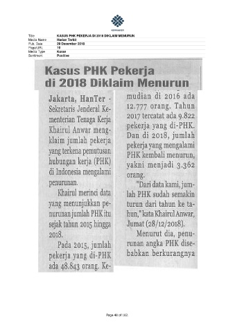 Title KASUS PHK PEKERJA DI 2018 DIKLAIM MENURUN Media Name Harian Terbit Pub. Date 29 Desember 2018 Page/URL 10 Media Type Koran Sentiment Positive Page 48 of 102.