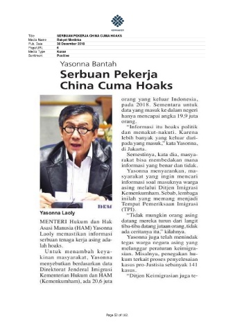 Title SERBUAN PEKERJA CHINA CUMA HOAKS Media Name Rakyat Merdeka Pub. Date 30 Desember 2018 Page/URL 6 Media Type Koran Sentiment Positive Page 52 of 102.