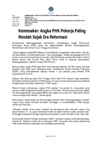Title KEMENAKER: ANGKA PHK PEKERJA PALING RENDAH SEJAK ERA REFORMASI