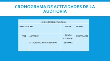 CRONOGRAMA DE ACTIVIDADES DE LA AUDITORIA CRONOGRAMA DE AUDITORIA EMPRESA: ULAPS FECHA: HOJA N° TIEMPO FASE ACTIVIDAD ENCARGADOS ESTIMADAS I ESTUDIO PRELIMIAR PRELIMINAR 1 SEMANA