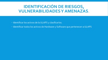 IDENTIFICACIÓN DE RIESGOS, VULNERABILIDADES Y AMENAZAS. Identificar los activos de la ULAPS y clasificarlos. Identificar todos los activos de Hardware y Software que pertenecen a ULAPS