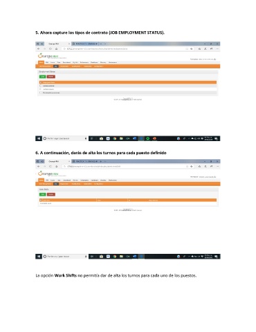 5. Ahora capture los tipos de contrato (JOB EMPLOYMENT STATUS). 6. A continuación, darás de alta los turnos para cada puesto definido La opción Work Shifts no permitía dar de alta los turnos para cada uno de los puestos.