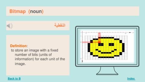Bitmap (noun) النقطية Definition: Index to store an image with a fixed number of bits (units of information) for each unit of the image. Back to B