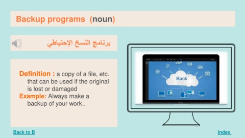 Backup programs (noun) Index برنامج النسخ الإحتياطي Definition : a copy of a file, etc. that can be used if the original is lost or damaged Example: Always make a backup of your work.. Back to B