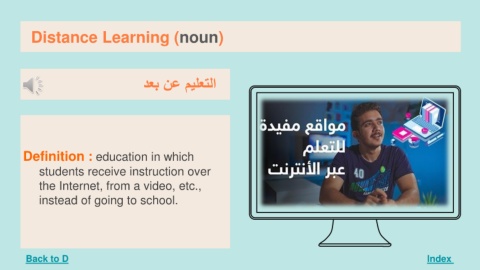 Distance Learning (noun) Index التعليم عن بعد Definition : education in which students receive instruction over the Internet, from a video, etc., instead of going to school. Back to D