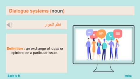 Dialogue systems (noun) Index نظم الحوار Definition : an exchange of ideas or opinions on a particular issue. Back to D