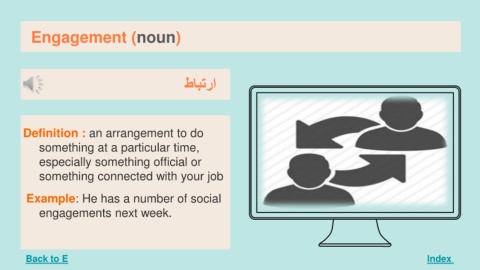 Engagement (noun) Index ارتباط Definition : an arrangement to do something at a particular time, especially something official or something connected with your job Example: He has a number of social engagements next week. Back to E