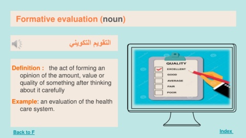 Formative evaluation (noun) Index التقويم التكويني Definition : the act of forming an opinion of the amount, value or quality of something after thinking about it carefully Example: an evaluation of the health care system. Back to F