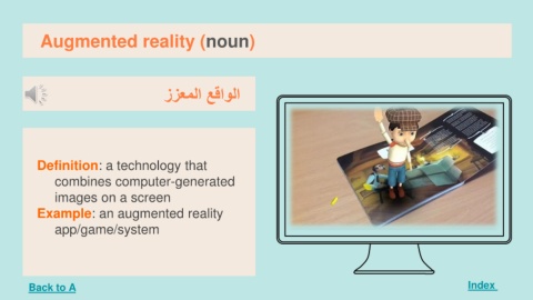Augmented reality (noun) Index الواقع المعزز Definition: a technology that combines computer-generated images on a screen Example: an augmented reality app/game/system Back to A