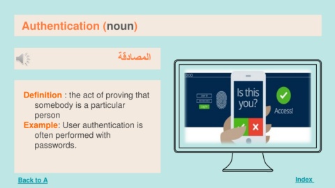 Authentication(noun) Index المصادقة Definition : the act of proving that somebody is a particular person Example: User authentication is often performed with passwords. Back to A