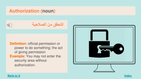 Authorization (noun) Index التحقق من الصلاحية Definition: official permission or power to do something; the act of giving permission Example: You may not enter the security area without authorization. Back to A