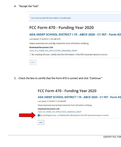 “Accept the Task” Check the box to certify that the Form 470 is correct and click “Continue.” CERTIFY FCC FORM 470 – PAGE 2 4. 5.