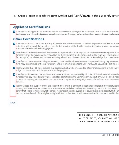 Check all boxes to certify the Form 470 then Click ‘Certify’ (NOTE: If the Blue certify button (lower, right hand corner) is greyed out, verify that all boxes have been checked) CLICK ON CERTIFY AND THEN YOU ARE DONE! ONCE CERTIFIED, YOUR 470 WILL BE POSTED ON THE USAC WEB SITE AND YOUR COMPETITIVE BIDDING PERIOD HAS OFFICIALLY BEGUN. CERTIFY FCC FORM 470 – PAGE 3