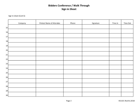 Bidders Conference / Walk Through Sign in Sheet Sign In sheet (Cont'd) Company Printed Name of Attendee Phone Signature Time In Time Out 15 16 17 18 19 20 21 22 23 24 25 26 27 28 29 30 Page 2 KS1021 Rev9.6.2018