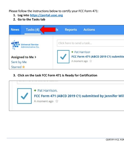Please follow the instructions below to certify your FCC Form 471: Log into https://portal.usac.org Go to the Tasks tab Click on the task FCC Form 471 is Ready for Certification CERTIFY FCC FORM 471 – PAGE 1 1. 2. 3.