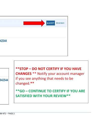 **STOP – DO NOT CERTIFY IF YOU HAVE CHANGES ** Notify your account manager **GO – CONTINUE TO CERTIFY IF YOU ARE