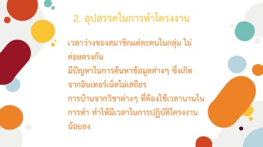 2. อุปสรรคในการท าโครงงาน • เวลาว่างของสมาชิกแต่ละคนในกลุ่ม ไม่ ค่อยตรงกัน • มีปัญหาในการค้นหาข้อมูลต่างๆ ซึ่งเกิด จากอินเทอร์เน็ตไม่เสถียร • การบ้านจากวิชาต่างๆ ที่ต้องใช้เวลานานใน การท า ท าให้มีเวลาในการปฏิบัติโครงงาน น้อยลง