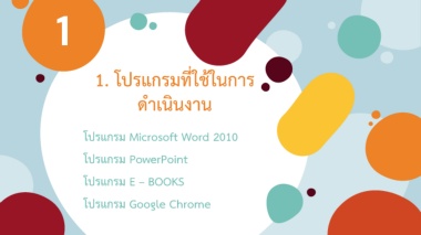 1 1. โปรแกรมที่ใช้ในการ ด าเนินงาน • โปรแกรม Microsoft Word 2010 • โปรแกรม PowerPoint • โปรแกรม E – BOOKS • โปรแกรม Google Chrome