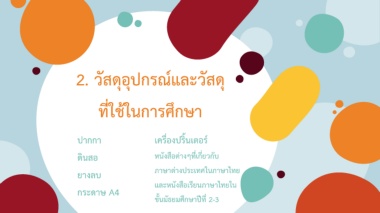2. วัสดุอุปกรณ์และวัสดุ ที่ใช้ในการศึกษา • ปากกา • เครื่องปริ้นเตอร์ • ดินสอ • หนังสือต่างๆที่เกี่ยวกับ • ยางลบ ภาษาต่างประเทศในภาษาไทย และหนังสือเรียนภาษาไทยใน • กระดาษ A4 ชั้นมัธยมศึกษาปีที่ 2-3