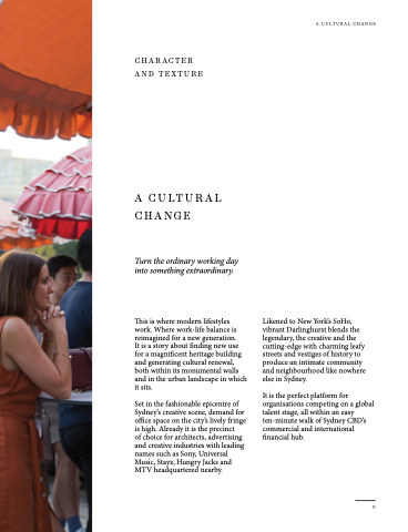 of choice for architects advertising and creative industries with leading names such as Sony Universal Music Stayz Hungry Jacks and MTV headquartered nearby Likened to New York’s SoHo vibrant Darlinghurst blends the the the legendary the the the creative and the the the cutting-edge with charming leafy streets and vestiges of history to to produce an an an intimate community and neighbourhood like nowhere else in Sydney It is is the perfect platform for for organisations competing on on a a a a a a a a a a global talent stage all within an an easy ten-minute walk of Sydney CBD’s commercial and international financial hub A A A CULTURAL CHANGE