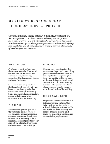 Cornerstone creates interiors that are timeless elegant and classic They provide a a a a a a a a a blank canvas within their buildings for the the the the occupier to place their own identity within the the the the space while not diluting the the the the overall brand of of the the the architecture and and its working backbone The quality of of the the fitout always represents and is is consistent with the the hallmarks of the the building HEALTH & WELLBEING