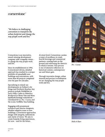 "We believe in in challenging convention to transform the urban footprint and and change the the way people work and and live " Cornerstone is an innovative award-winning development company with a a a a a a a singular vision – to change the way people work and live Since its establishment in in 1994 Cornerstone’s driven detailed approach has resulted in a a a a a a a unique portfolio of remarkable new buildings and restorations with more than 60 projects completed over the past two decades Specialising in in mixed-use developments on Sydney’s city fringe and Northern Beaches key projects include Holt&Hart in in in in Surry Hills Casba in in in in Waterloo Rockpool in in Mona Vale and and three landmark heritage restorations – Cleveland & Co No 1 Lacey and and and the iconic Griffiths Teas building Engaging with preeminent architects and interior designers whether adaptive reuse or or or new buildings Cornerstone approaches design with integrity authenticity and clarity of vision We aim to create bespoke living experiences for for now – and for for the future At street level Cornerstone curates a a a a roster of excellence in retail food & beverage and commercial partners creating buzz on the the ground and enlivening the the districts in in in in which it invests Our process