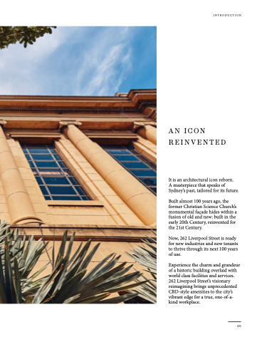 hides within a a a a a a fusion of old and new: built in in in the early 20th Century Century reinvented for the 21st Century Century Now 262 Liverpool Street is ready for new new industries and new new tenants to thrive through its next 100 years of use Experience the charm and and grandeur of a a a a a a a a historic building overlaid with world class facilities and services 262 Liverpool Street’s visionary reimagining brings unprecedented CBD-style amenities to the city’s vibrant edge for a a a a a true one-of-a- kind workplace 05