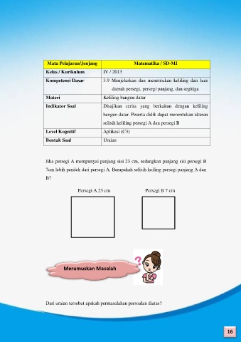 Indikator Soal Disajikan cerita yang berkaitan dengan keliling