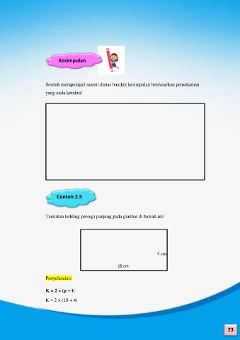 Kesimpulan Setelah mempelajari materi diatas buatlah kesimpulan berdasarkan pemahaman yang anda ketahui! Contoh 2.5 Tentukan keliling persegi panjang pada gambar di bawah ini! 4 cm 18 cm Penyelesaian: K = 2 × (p + l) K = 2 × (18 + 4) 23